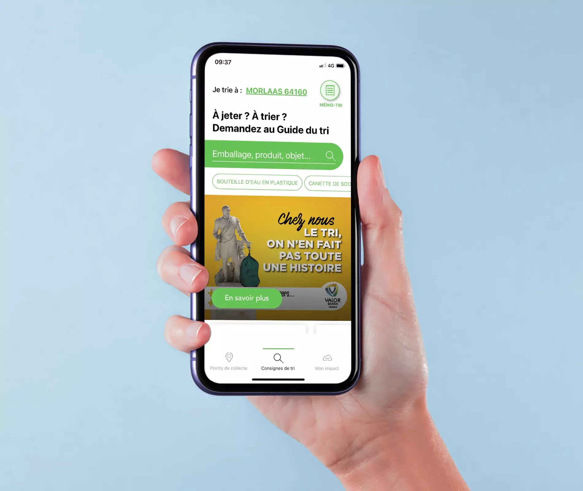 Est-ce que ce pot de yaourt va dans le bac jaune? Ce sachet de sucre? Cherchez le nom de votre déchet dans le moteur de recherche de l’application : le Guide du tri vous donne la bonne consigne de tri pour chaque élément d’emballage d'un produit.